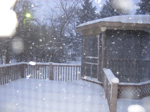 And the view out the back this morning - through the screen door - I couldn't open it - the snow is piled up.We're expecting 4" to 8" more throughout the day. I don't know if I should try to snow blow this morning or not. It's still windy, although not like it was, and by tonight the temps are going to drop precipitously. I guess I'll head out in a little while and see what I can do.